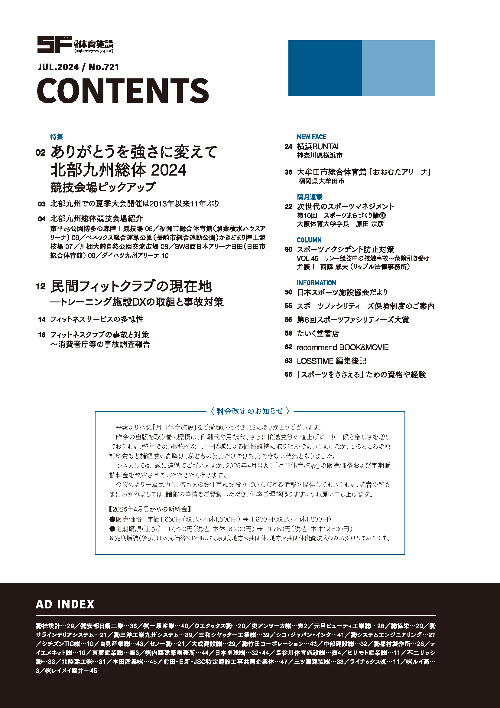 月刊体育施設2024年7月号は「北部九州総体」と「民間フイットネスクラブ」について特集しています。